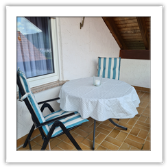 Darüber hinaus gibt es einen großen Balkon, ausgestattet mit Tisch und Stühlen, erreichbar vom Wohnzimmer aus. Selbstverständlich dürfen auch die Gäste der Ferienwohnung Ruhe und Entspannung im Garten finden.
